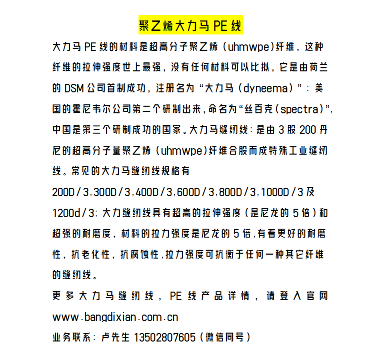大力马线,高分子纤维,聚乙烯纤维线,高拉力抗老化缝纫线