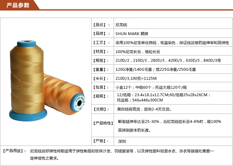 尼龙线的优势:100%纯尼龙,弹性十足,断裂延伸率达25-30%;尼龙线回弹性好,当尼龙线拉长至4-6%时,能100%回弹到原来的长度;软体海绵制品、弹性面料的最佳缝纫线拍档。