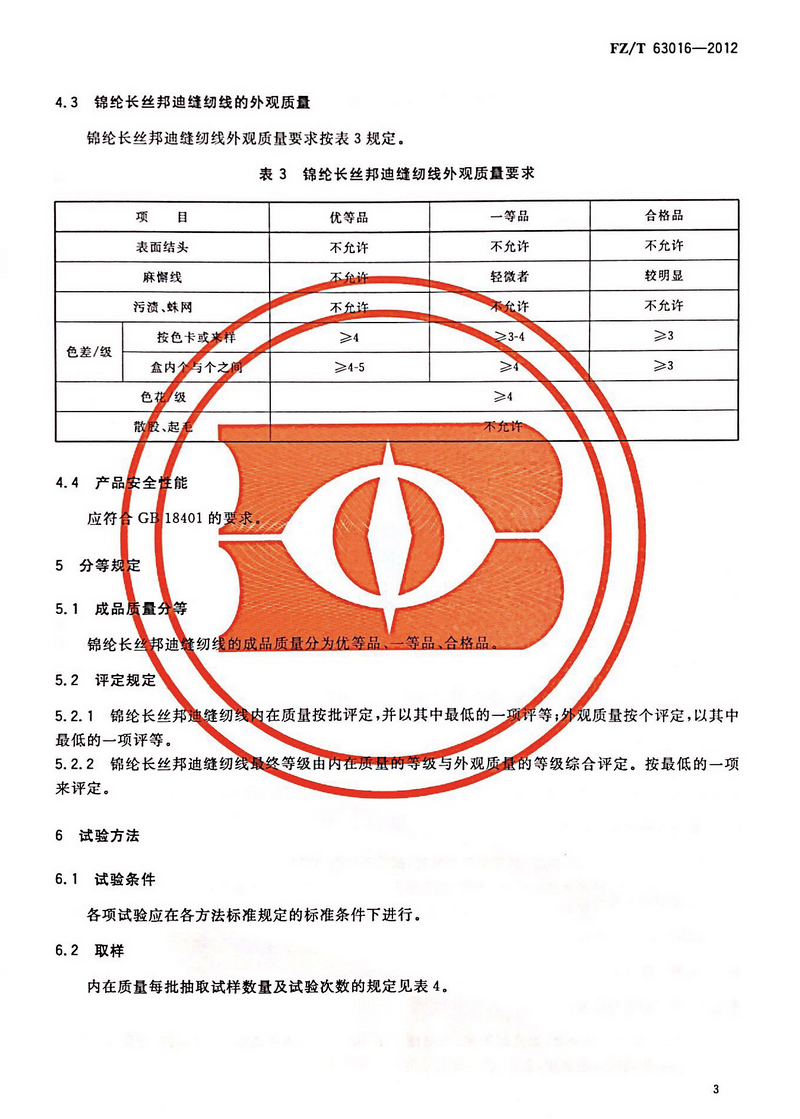 二、涤纶长丝缝纫线的分等规定:涤纶长丝高强缝纫线的产品质量分为优等品、一等品、合格品。按上述表格的等级要求,每批分别取样3-6个,每批总试验次数6-10次。分别对线密度、单线断裂强力,耐皂洗色牢度、耐摩擦色牢度、长度和结头数进行指标数值比对。并以其中最低的一项达标来评定等级。